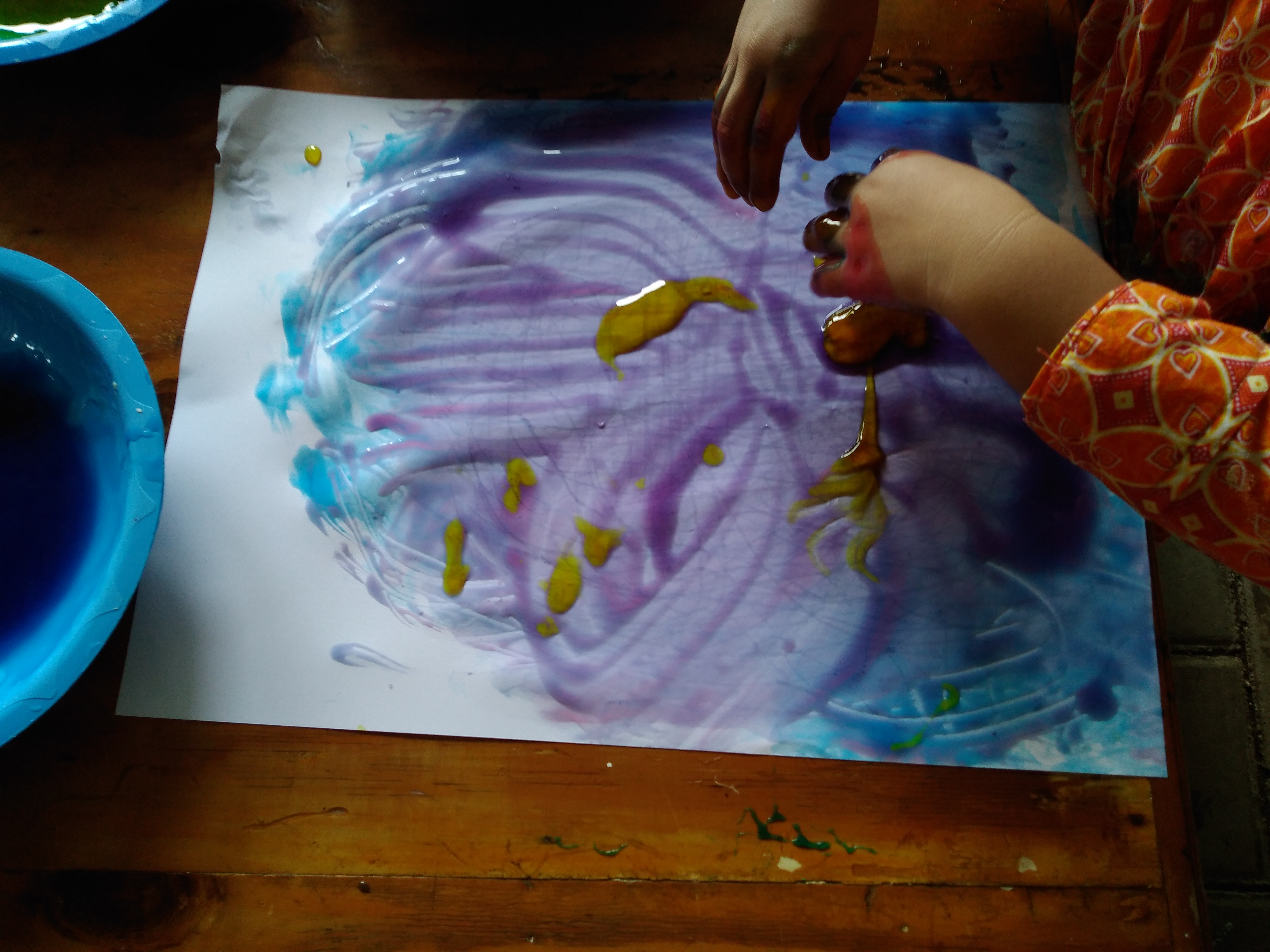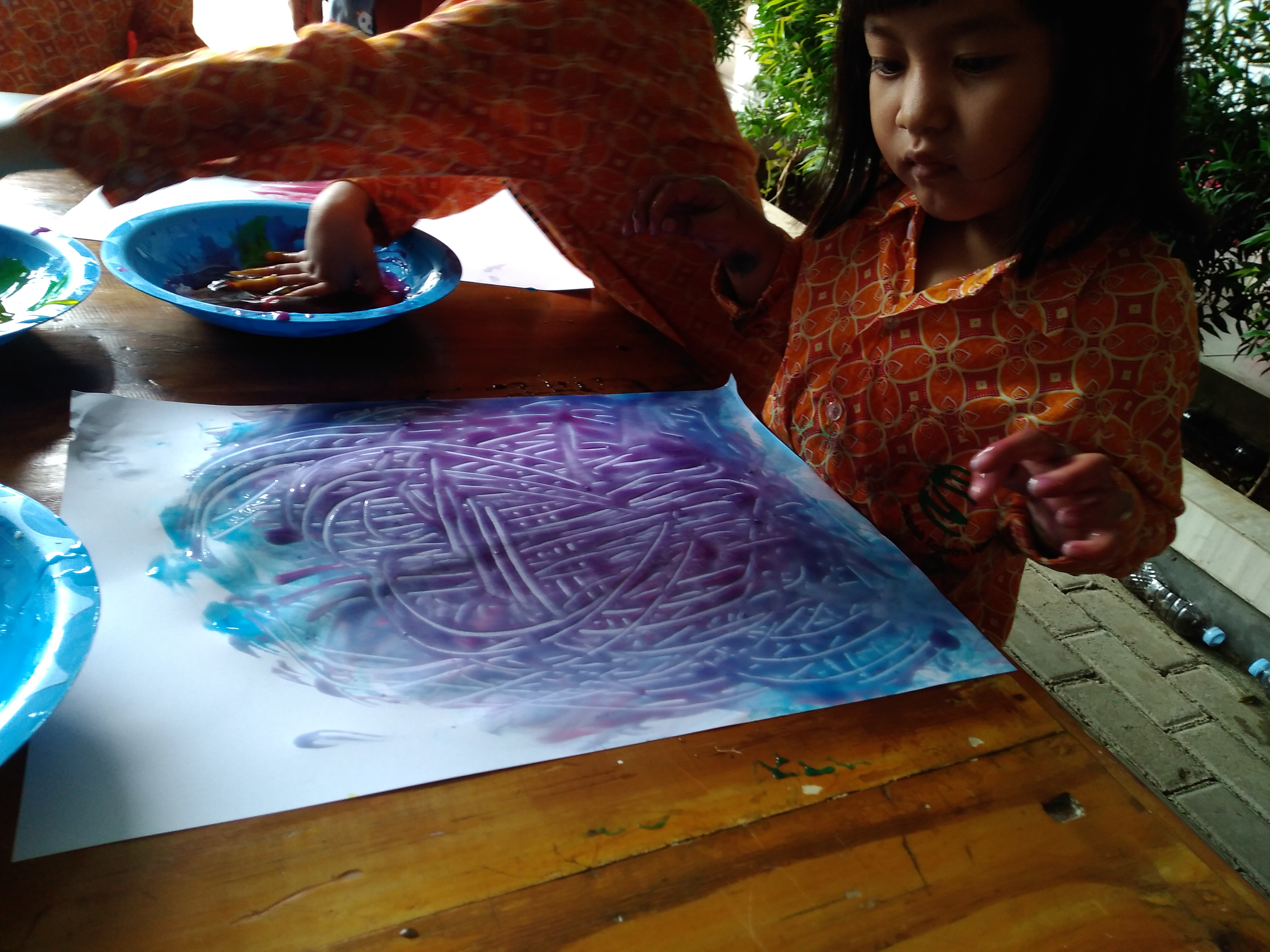 Anak-anak dibiarkan untuk mencampur warna yang dia sukai, kemudian mengaduk-ngaduknya dengan tangan dan jarinya. Siapkan kertas yang tebal, lalu ajak anak membentuk apa saja yang dia sukai diatas kertas tersebut.